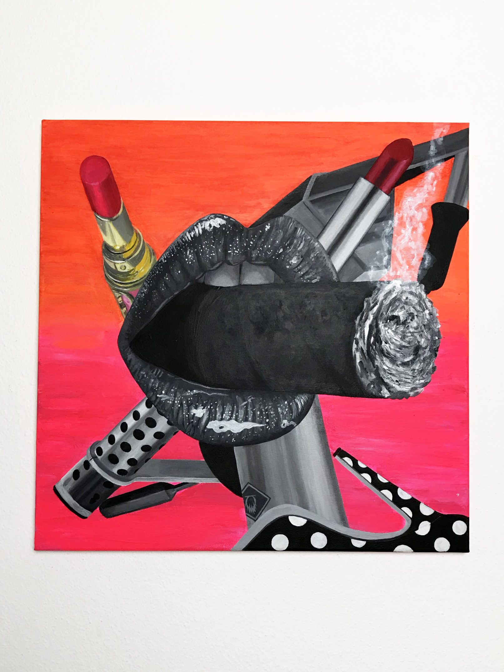 [SV] Massförförelse vapen. Formspel mellan skönhetsprodukter och vapen. Kvinnor måste tycka att det är kul att förföra andra, men framför allt måste de behaga sig själva. Det viktiga är att de får förfoga över sina kroppar som de vill. Denna serie av konstverk representerar starka kvinnor med Betydande kvinnlighet.